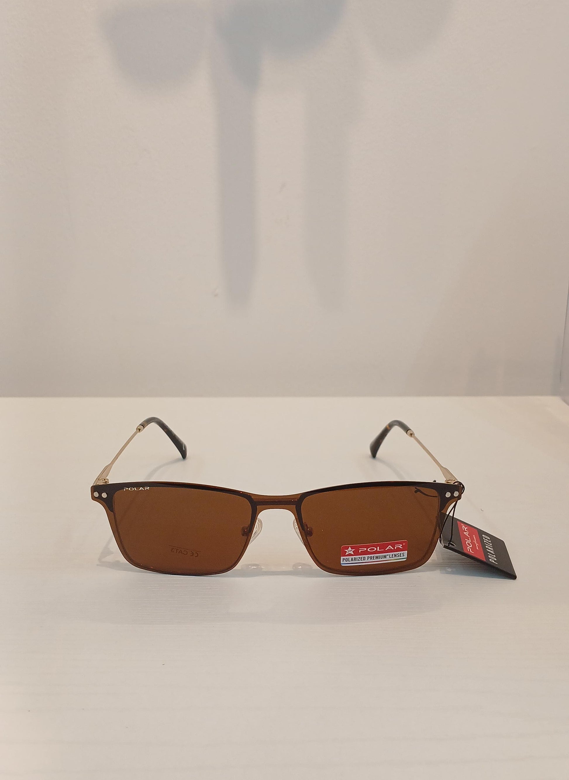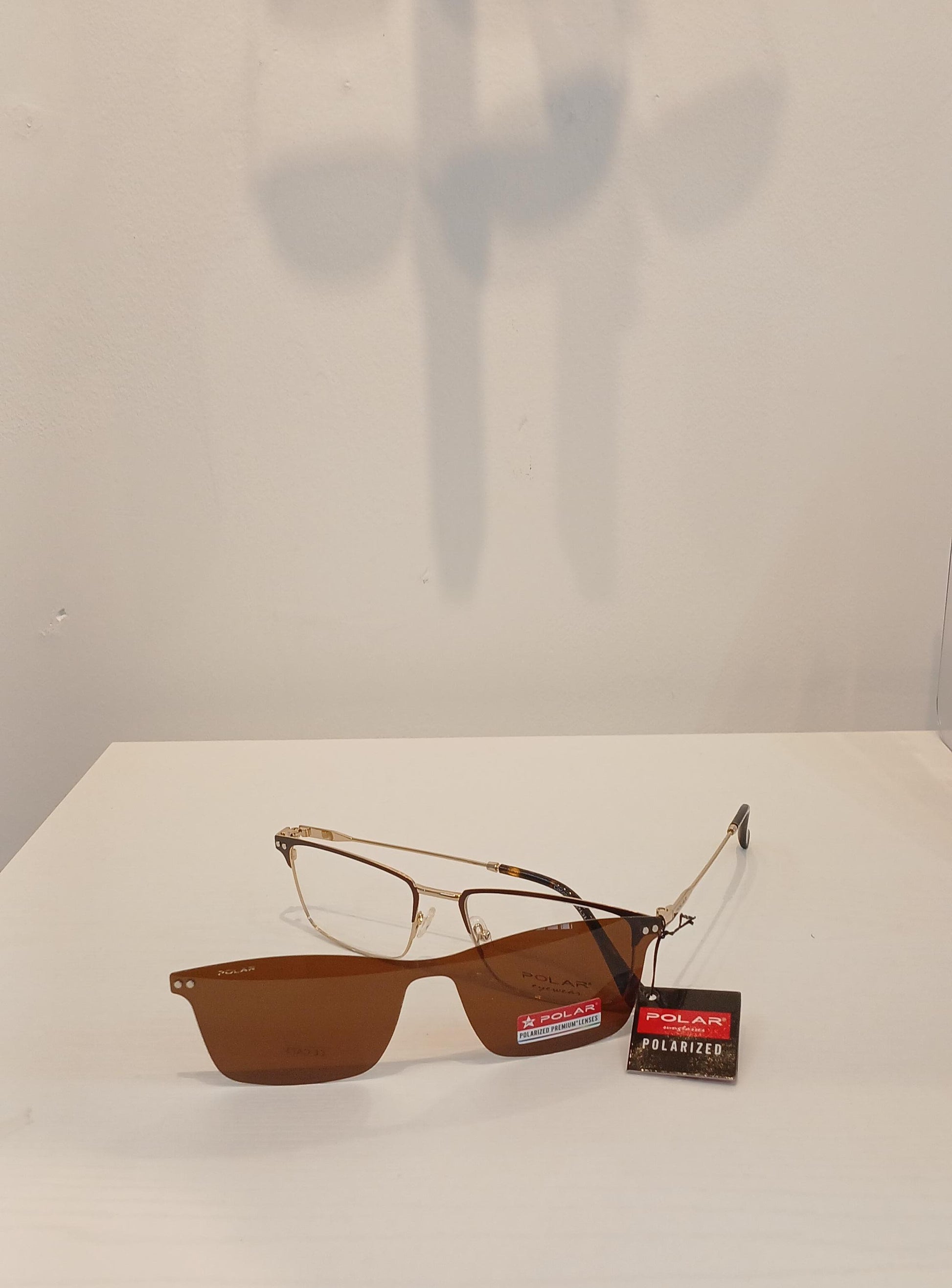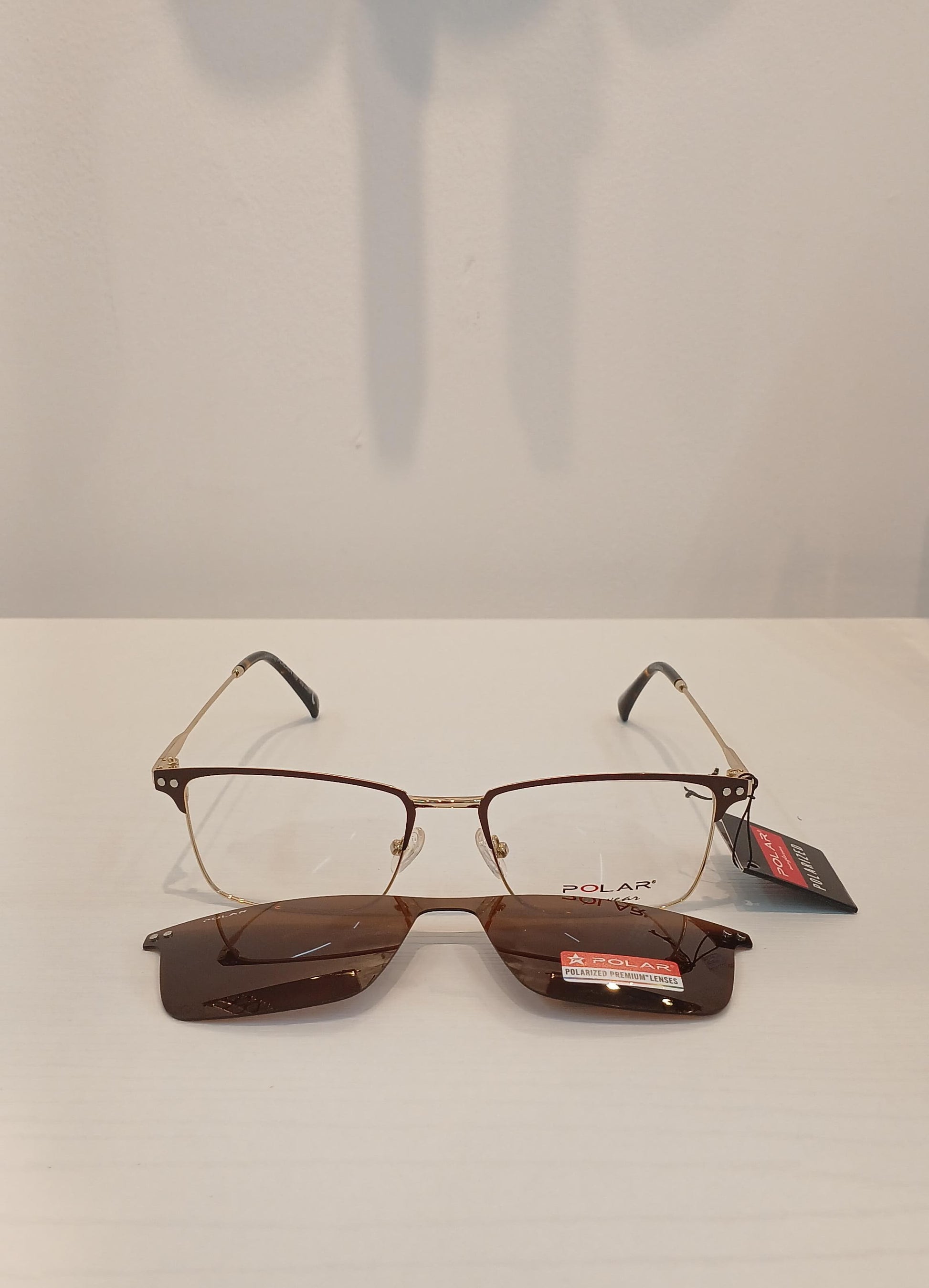 POLAR DARK BROWN MATTE, GOLD TITANIUM GLASSES FRAMES W/ COPPER TINTED POLARIZED CLIP ON